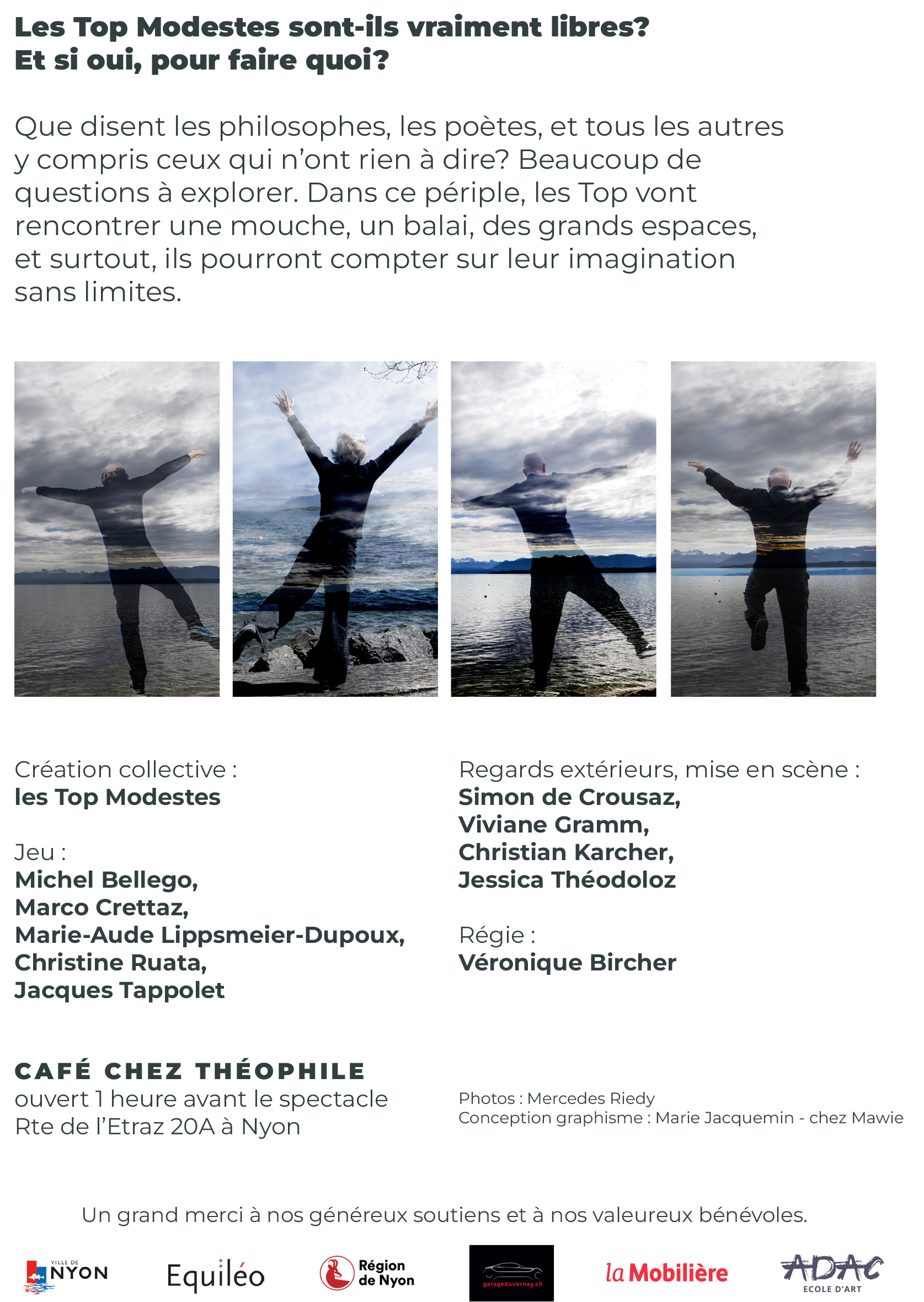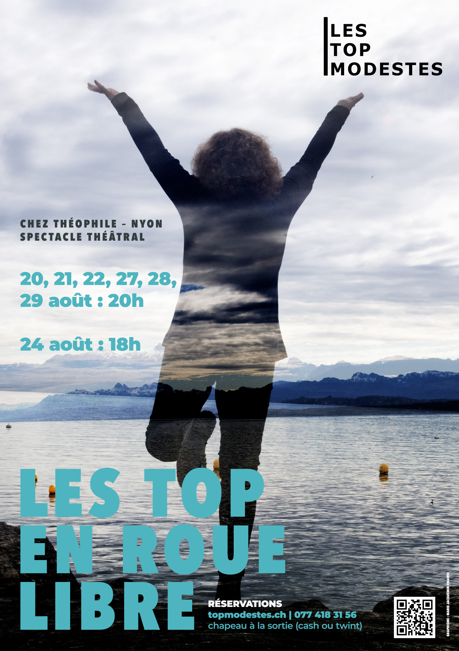 J’ai eu la chance de réaliser l’affiche des Top Modestes pour leur spectacle d’août 2025. Petite anecdote : mon tout premier mandat à l’atelier de Roger Pfund concernait déjà les Top Modestes. Sous sa direction, j’avais conçu leur première affiche. Quelques années plus tard, après son décès, ce projet a pris une valeur toute particulière : une sorte de passage de relais. Le mandat comprenait la création d’une affiche F4, d’une banderole et d’un flyer A5 recto verso. La consigne : utiliser les photos des comédiens, réalisées au bord du lac par une photographe de la région de Nyon.